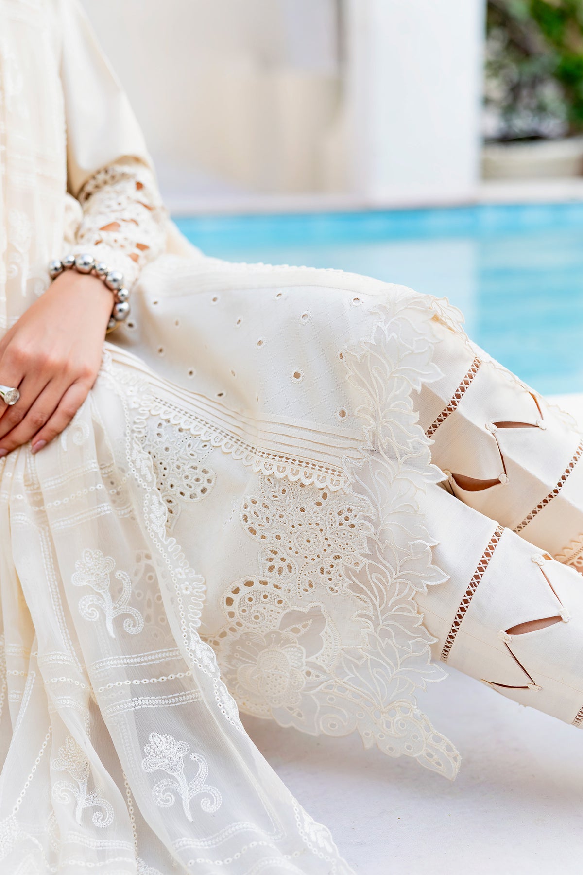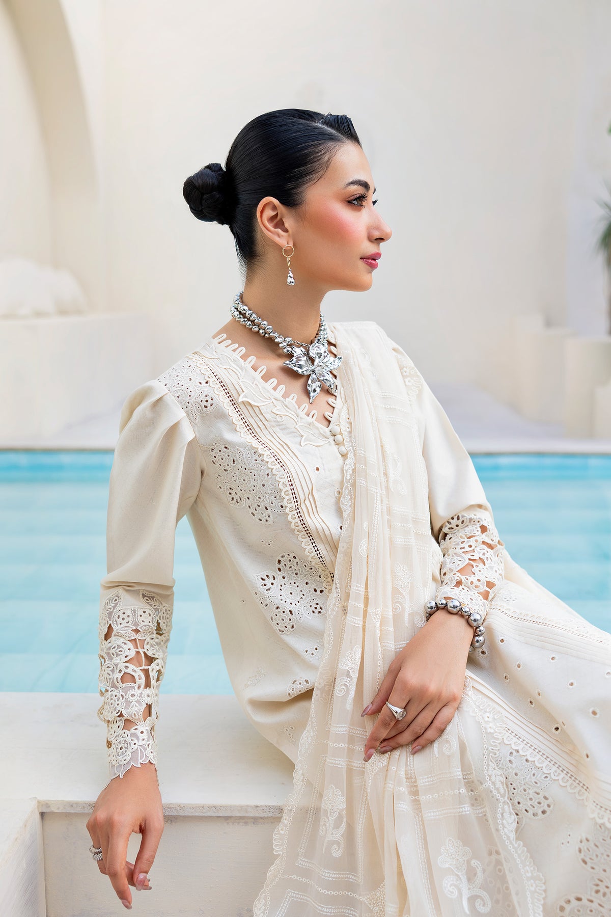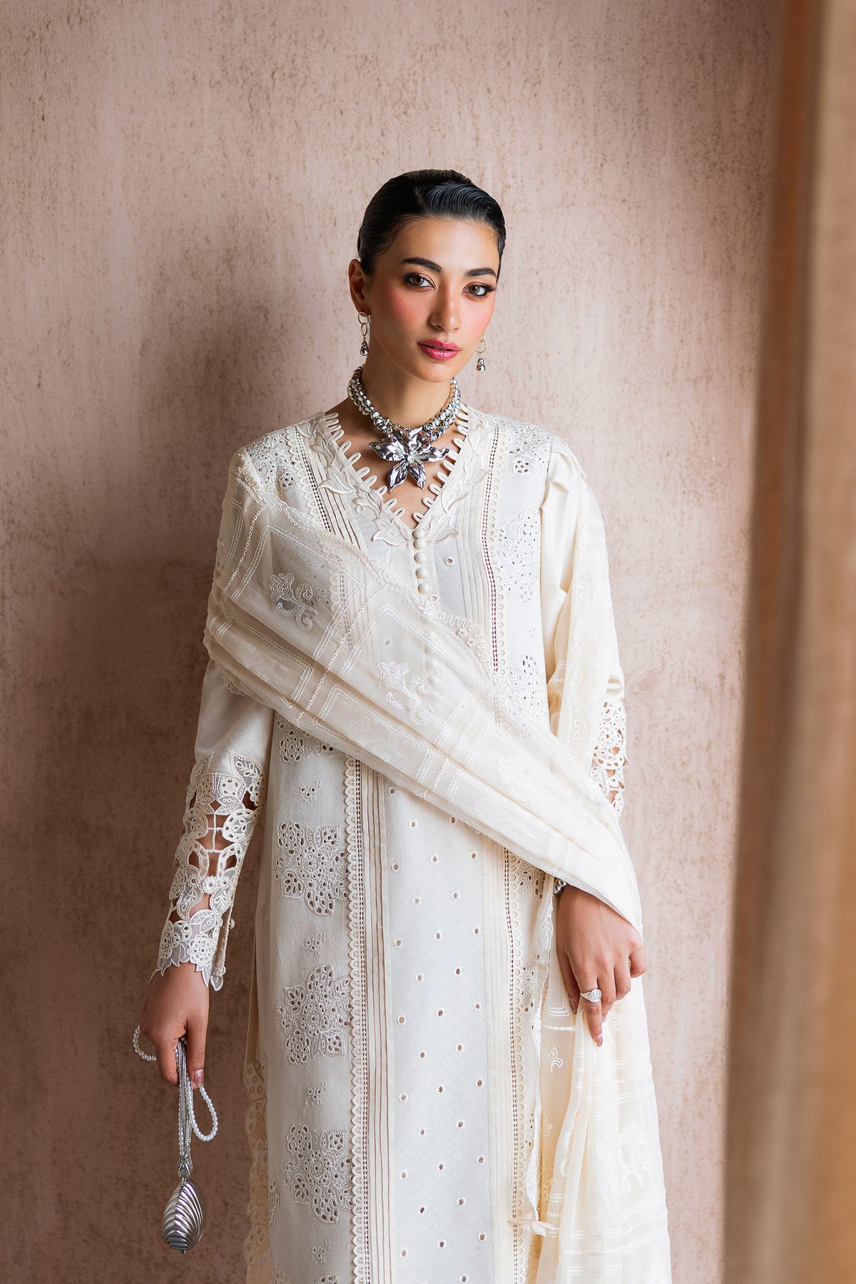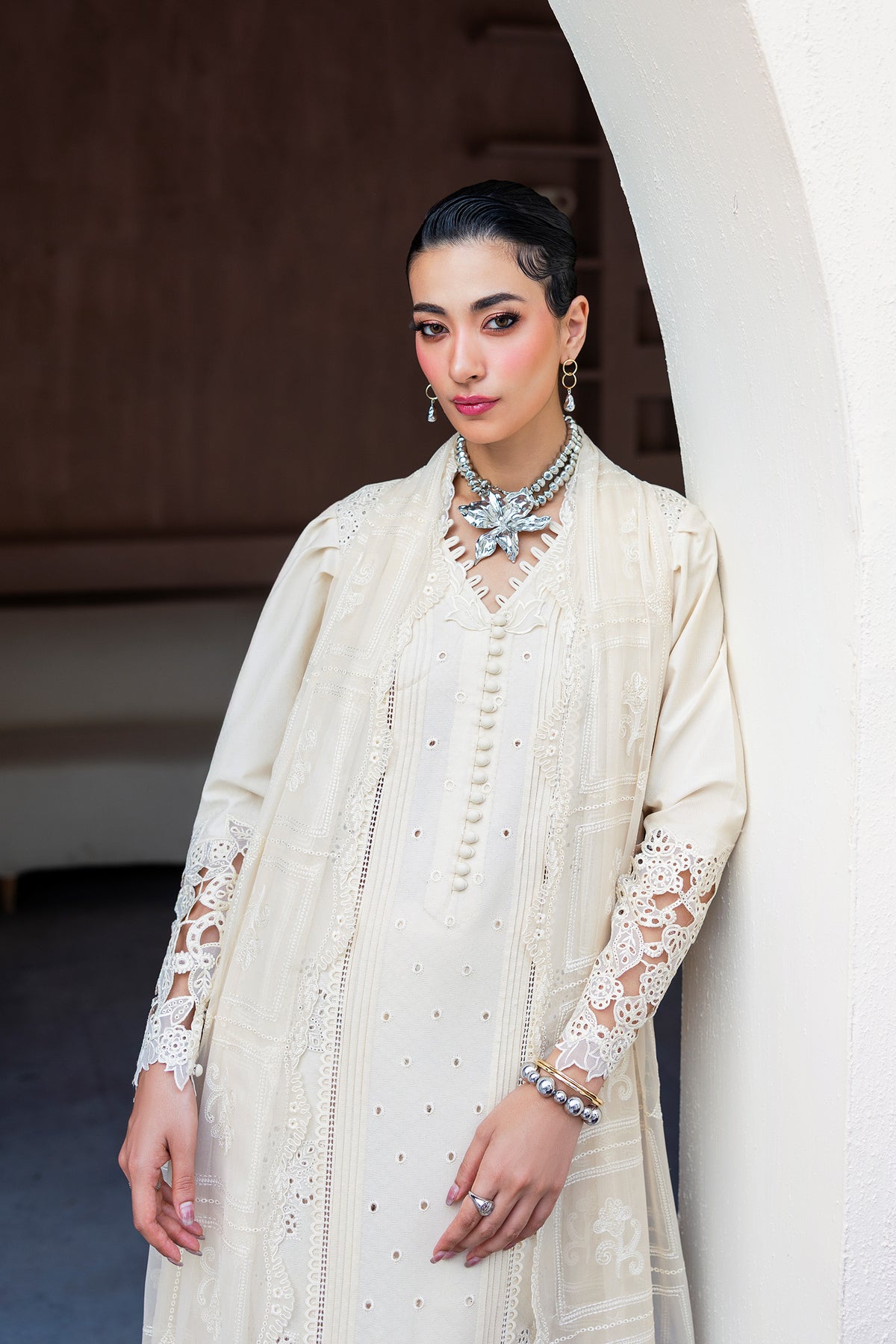 Halo features a jacquard weaved shirt paired with a flowing chiffon dupatta and cotton trousers, brought together in serene ivory tones for graceful everyday elegance.