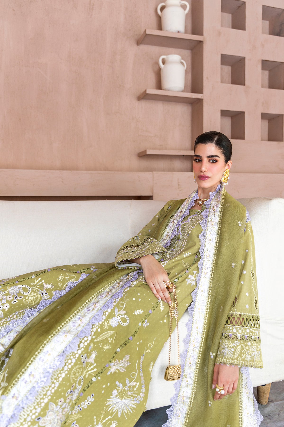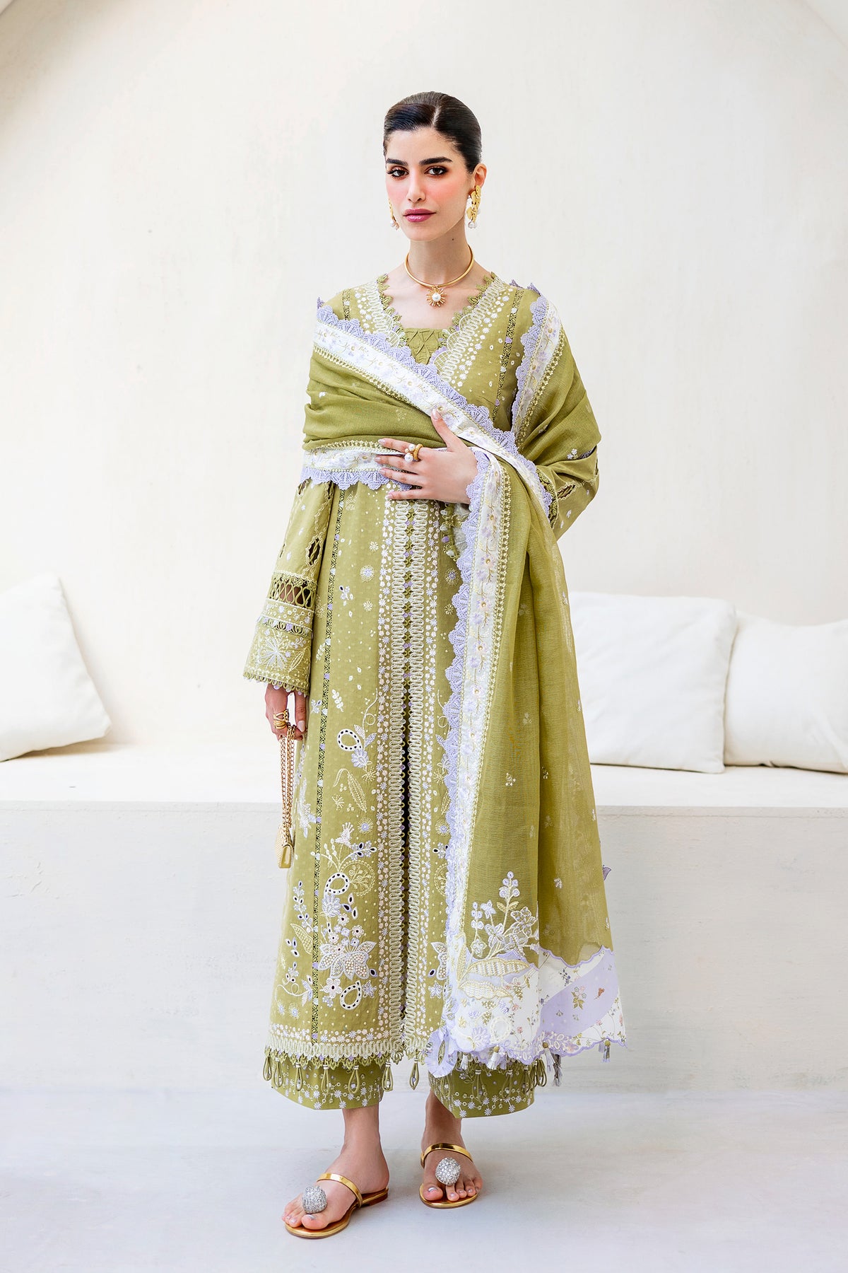 Willow features a jacquard weaved shirt with a cotton net dupatta and cotton trousers, designed in gentle tones for effortless femininity.
